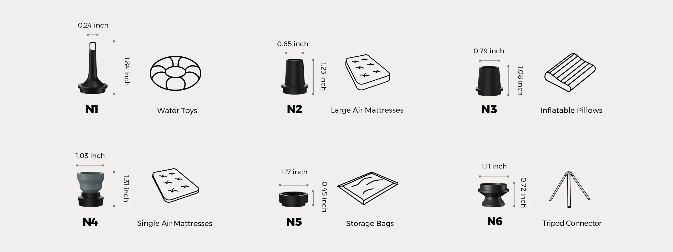 - Adaptable – Comes with 6 x nozzles, use to quickly inflate/deflate air mattresses, swimming rings, air beds, and inflatable children’s toys;
