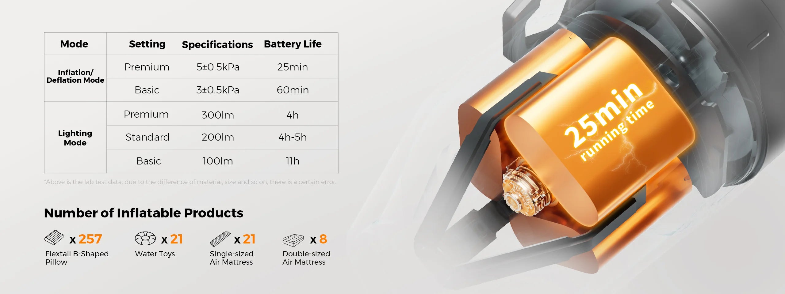 - Long-lasting – From one charge you can inflate a double-sized air bed mattress at least 8 times.